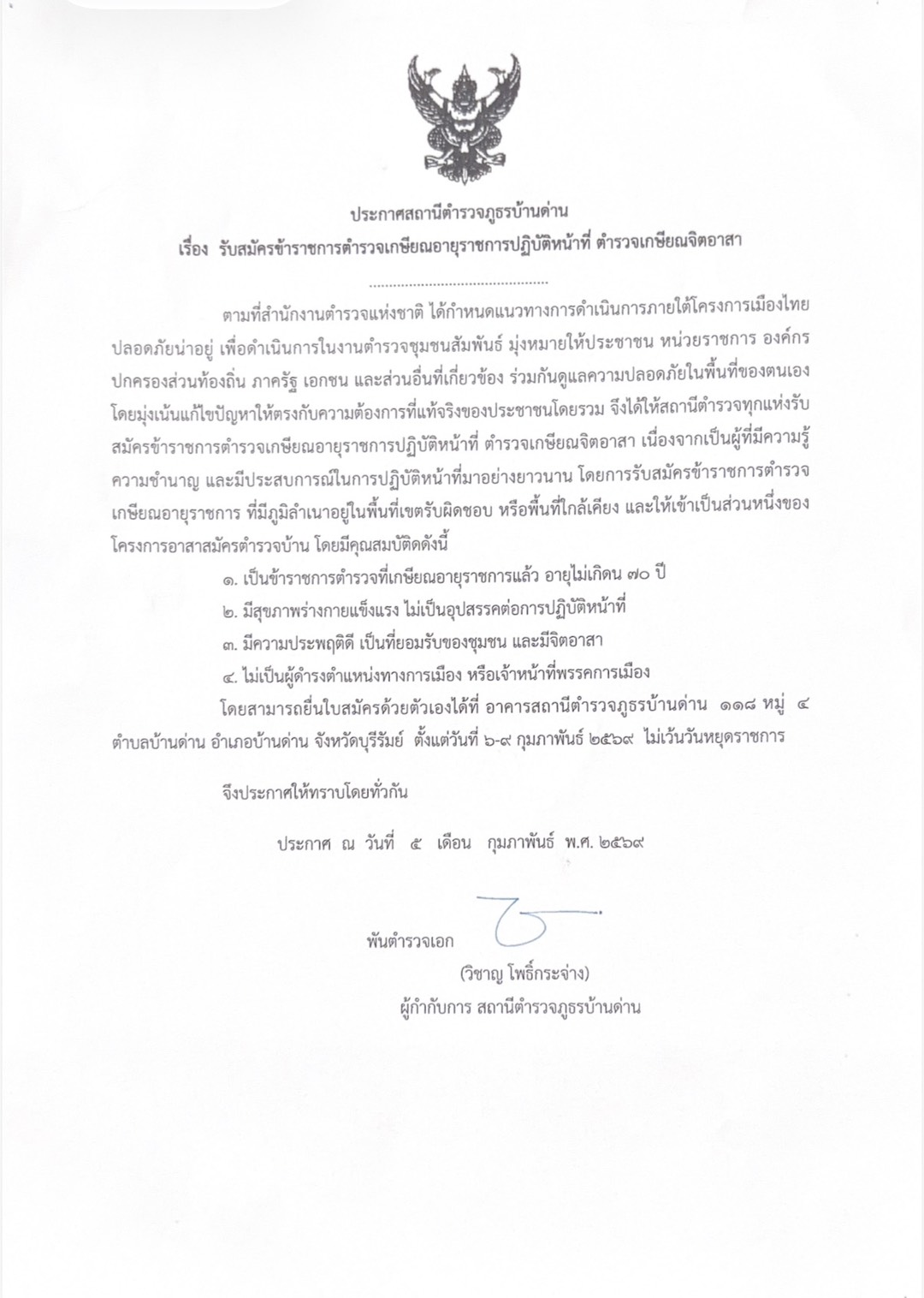 ด้วยสถานีตำรวจภูธรบ้านด่าน มีความประสงค์เปิดรับสมัครข้าราชการตำรวจที่เกษียณอายุราชการแล้ว เข้าร่วมโครงการ “ตำรวจเกษียณจิตอาสา” เพื่อร่วมเป็นกำลังสำคัญในการช่วยเหลือราชการ ดูแลชุมชน และเสริมสร้างความเข้มแข็งด้านความปลอดภัยในพื้นที่ โดยอาศัยองค์ความรู้ ความชำนาญ และประสบการณ์ในการปฏิบัติงานของข้าราชการตำรวจที่สั่งสมมาอย่างยาวนาน
