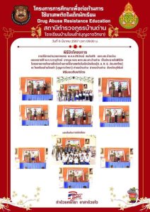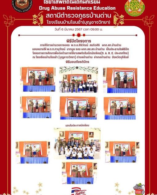 มอบหมายให้ พ.ต.ท.ภานุวัฒน์ มากมูล สภ.บ้านด่าน เป็นประธานพิธีปิดโครงการการศึกษาเพื่อต่อต้านการใช้ยาเสพติดในเด็กนักเรียน(D. A. R. E. ประเทศไทย)