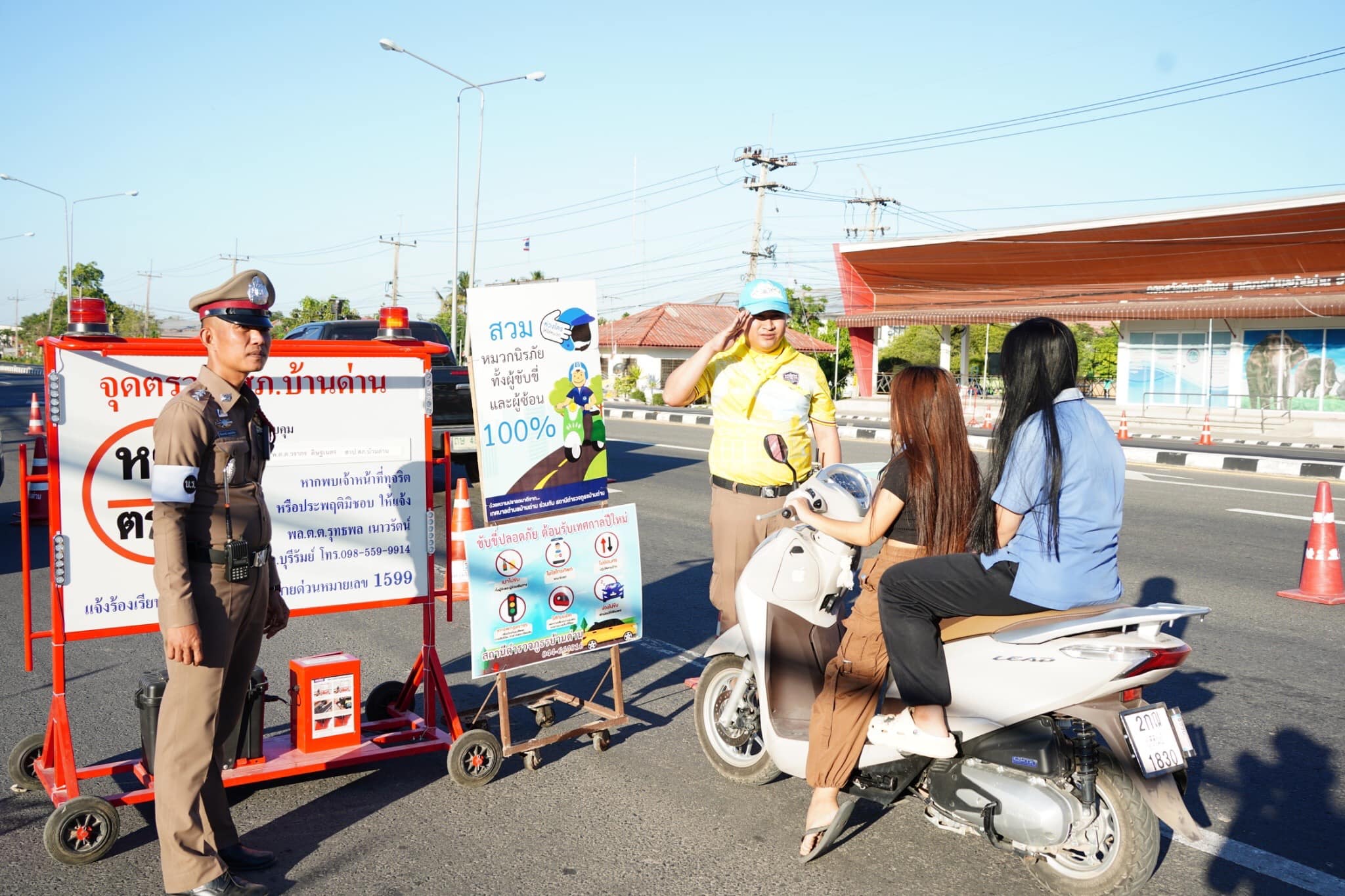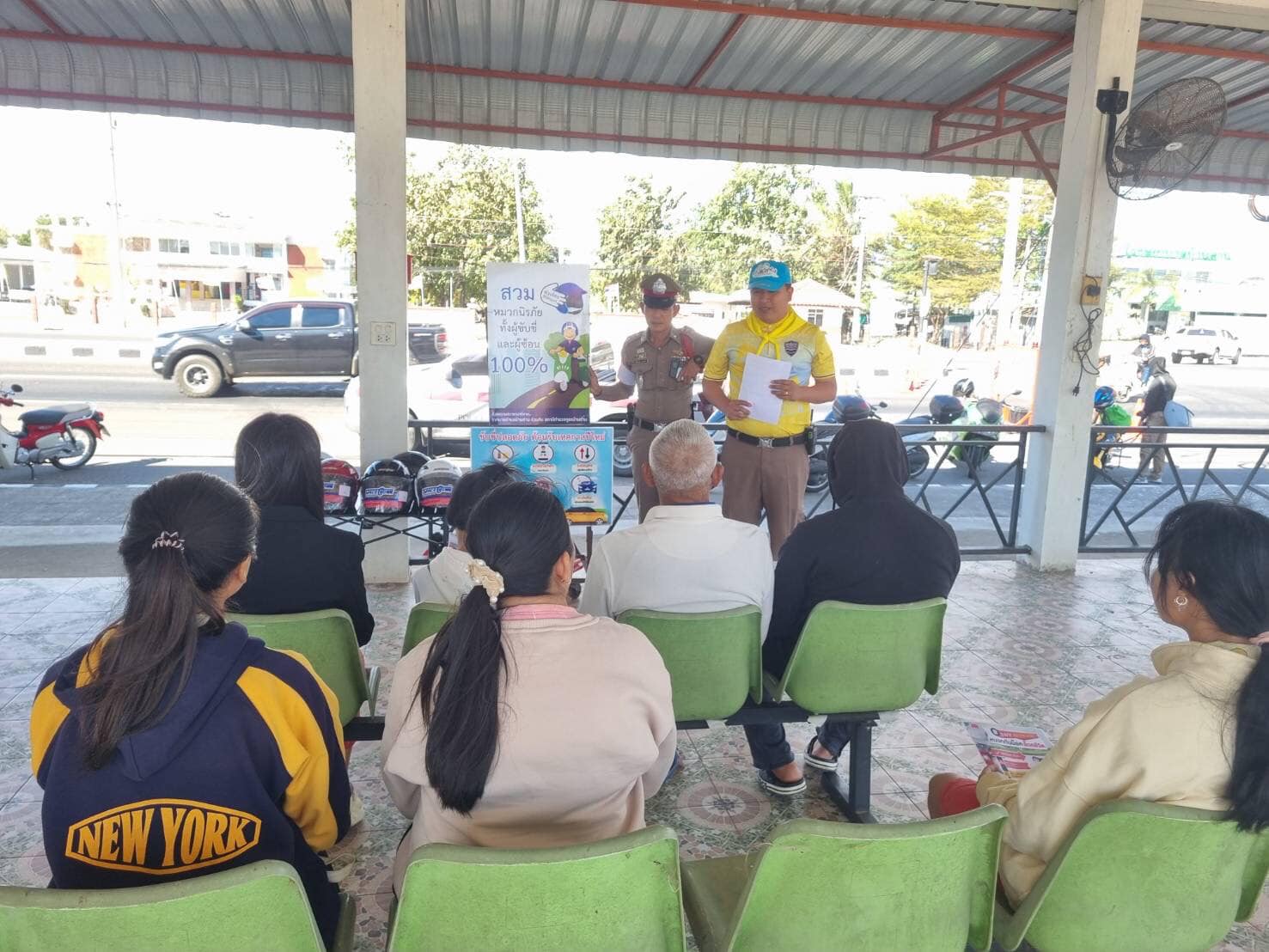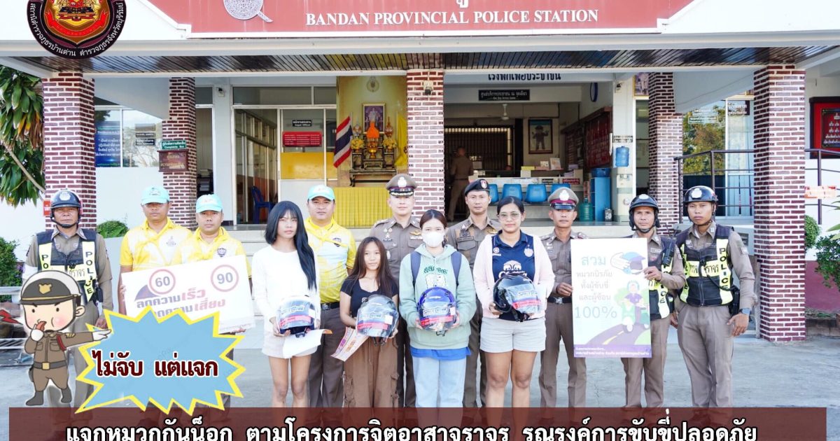 พร้อมด้วย พ.ต.ท.กรกช จงนิมิตรสถาพร รอง ผกก.ป.สภ.บ้านด่าน,พ.ต.ต.วรากร ดิษฐเนตร สวป.สภ.บ้านด่าน ร่วมกับร้อยเวรจราจร พร้อมกำลังเจ้าหน้าที่สายตรวจจราจรฯ,เจ้าหน้าที่ตำรวจชุดจิตอาสา สภ.บ้านด่าน ดำเนินการแจกหมวกนิรภัยแก่ประชาชน ตามโครงการจิตอาสาจราจร รณรงค์การขับขี่ปลอดภัย สวมหมวกนิรภัยเพื่อลดอุบัติเหตุจราจรทางบก ช่วงเทศกาลปีใหม่ พ.ศ.2568 ตามนโยบายของ ตร. และตามนโยบายของตำรวจภูธร ภาค 3
