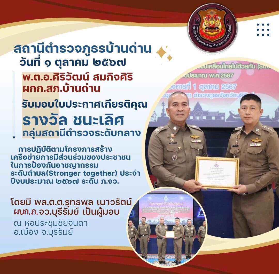 นที่ 1 ตุลาคม 2567 พ.ต.อ.ศิริวัฒน์ สมกิจศิริ ผกก.สภ.บ้านด่าน รับมอบใบประกาศเกียรติคุณ รางวัลชนะเลิศ