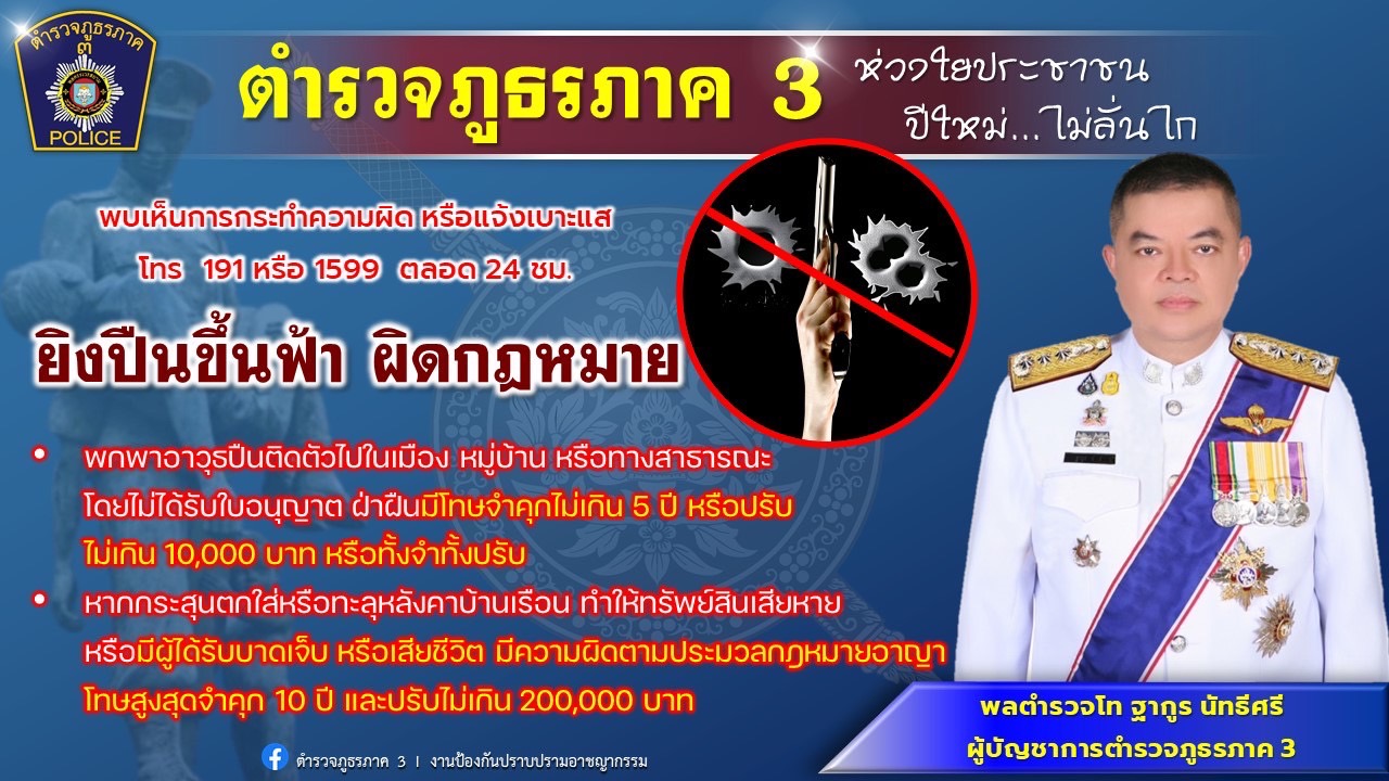 ตำรวจภูธรภาค 3 ห่วงใยประชาชน ปีใหม่…ไม่ลั่นไก หากพบเห็นการกระทำผิด หรือแจ้งเบาะแส
